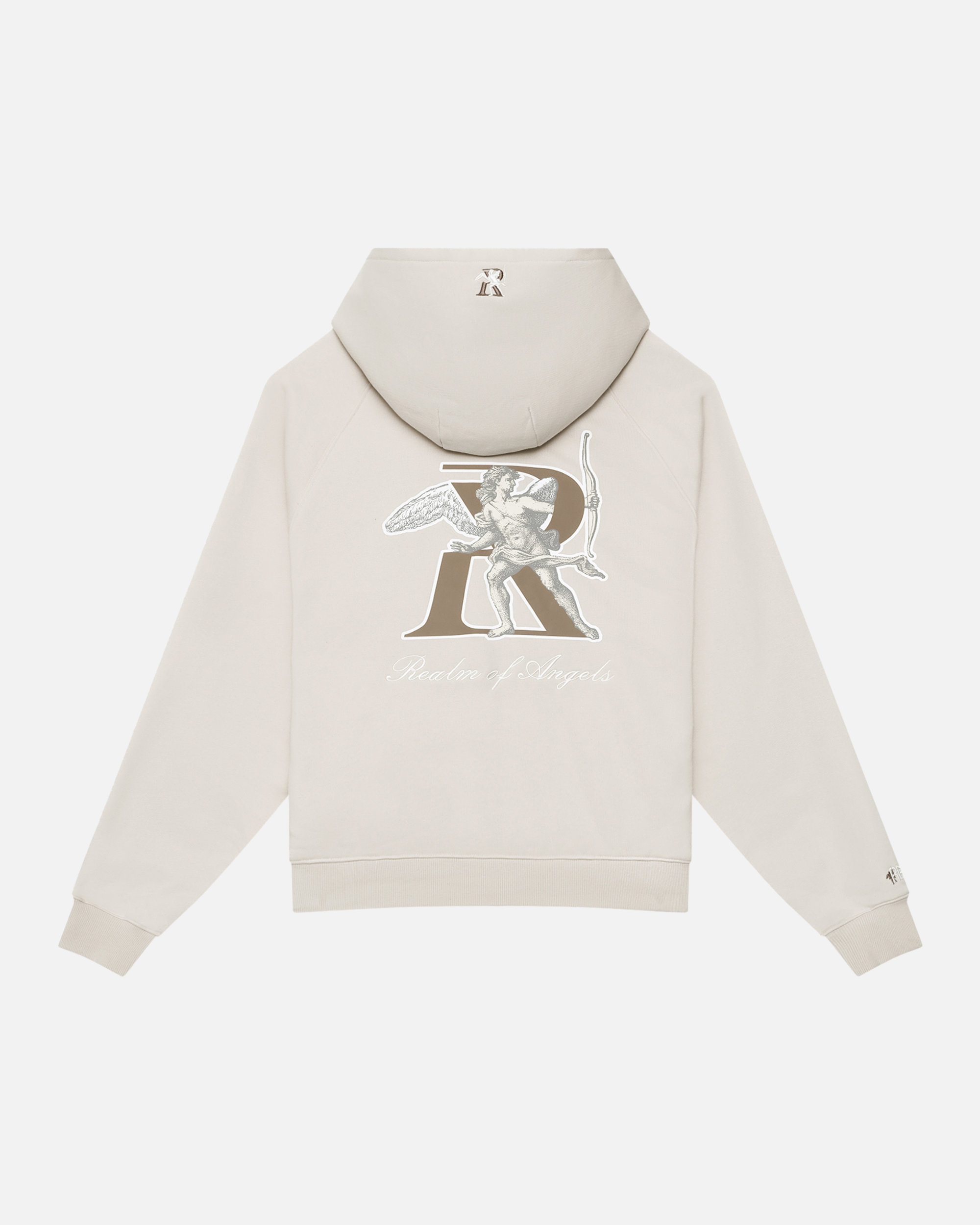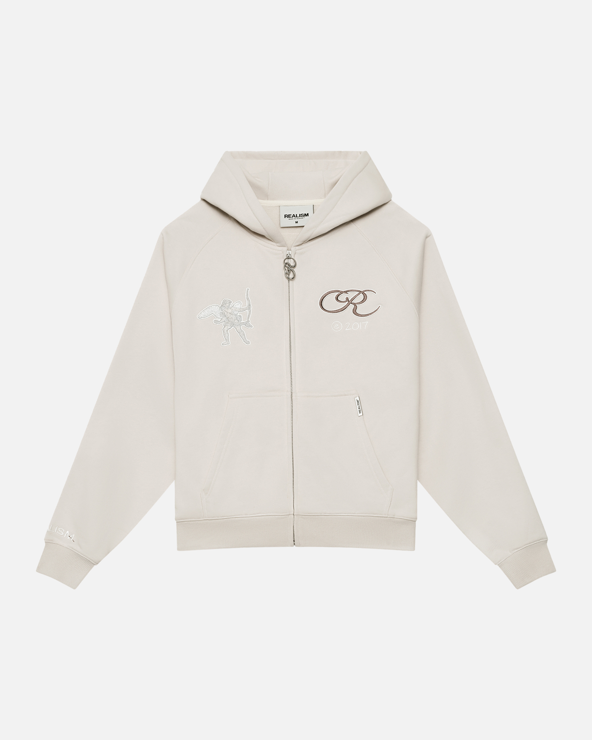 Reach celestial heights with the Apollo Zip Hoodie in Dune. Crafted from Realism signature 350 GSM fleece, this piece embodies structure and comfort with a cropped, boxy silhouette. The back showcases a large Apollo graphic with cursive embroidery detailing. A nod to divine strength and modern expression. Elevated with high-density embroidery across the chest and hood, and finished with a custom alloy metal cursive “R” branded zip and metal logo clamp on the pocket for a refined touch.
