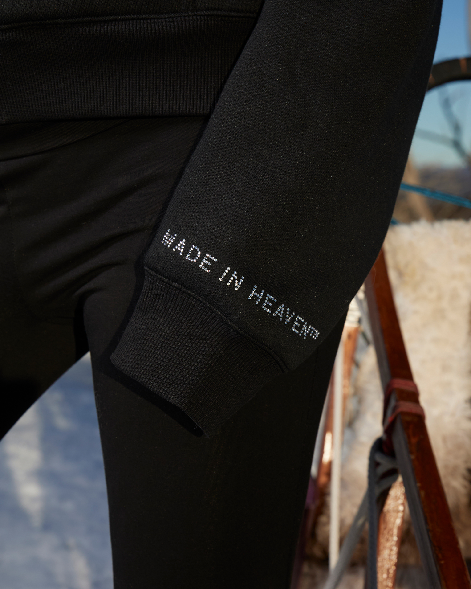 - Bedazzled logo detail on sleeve