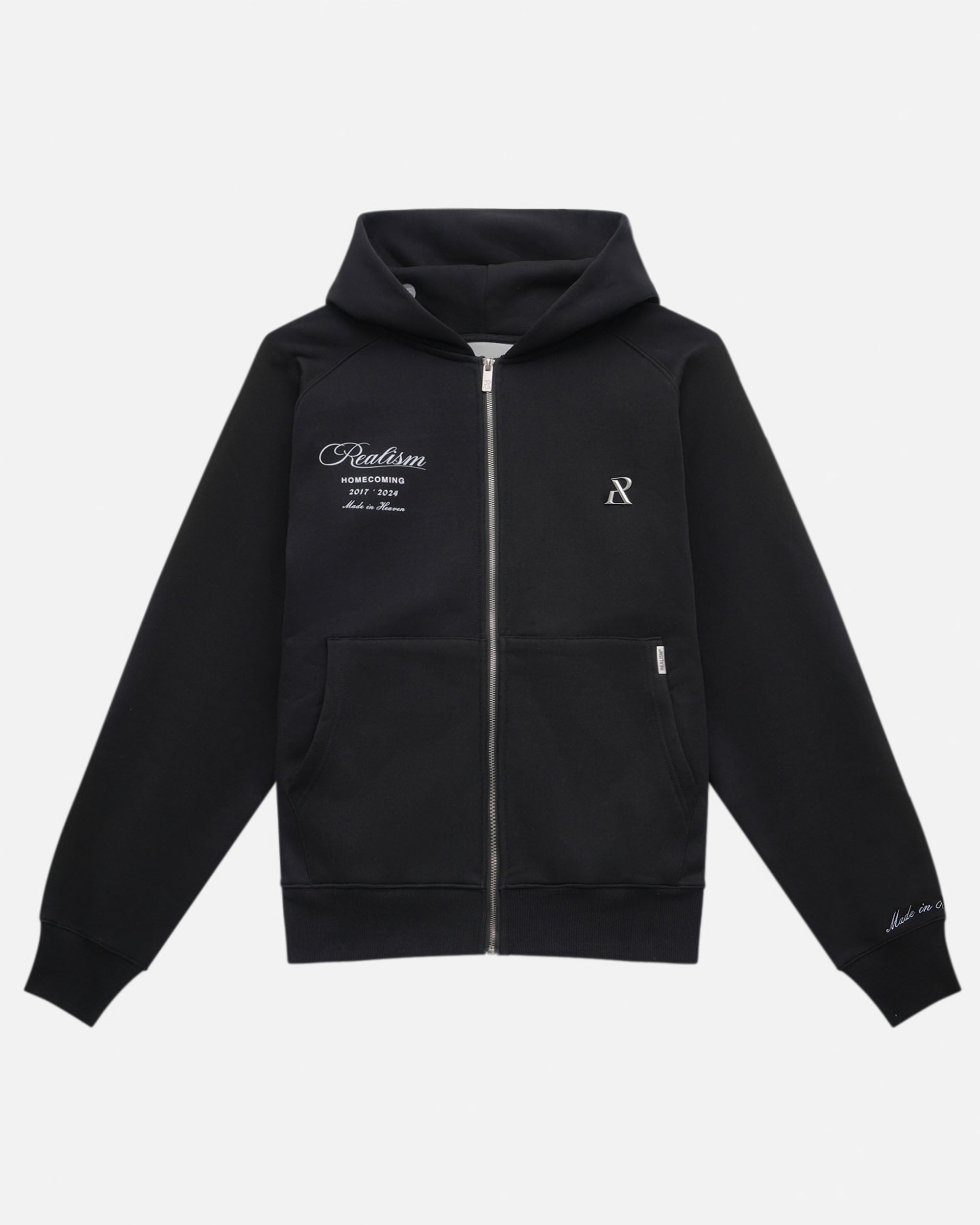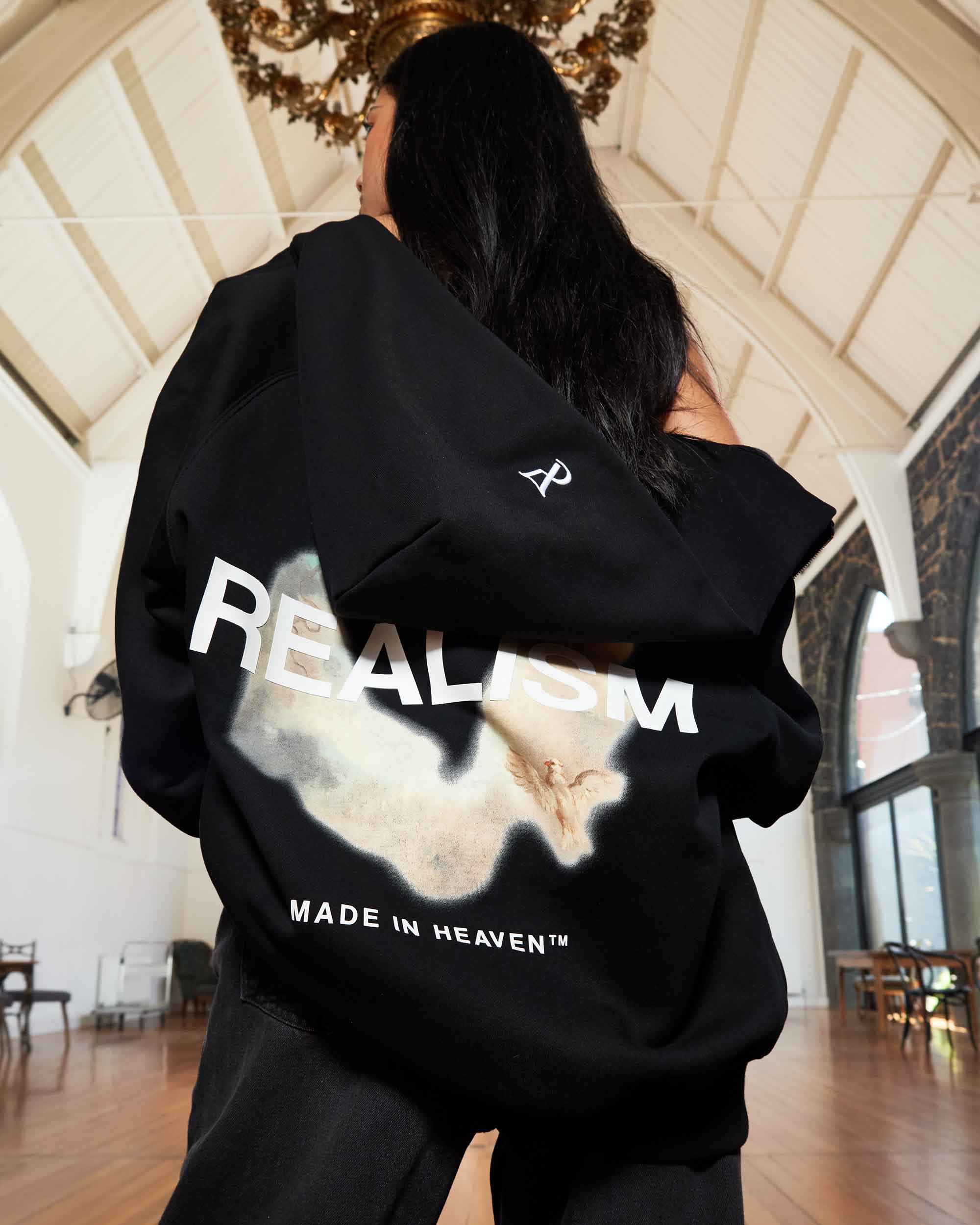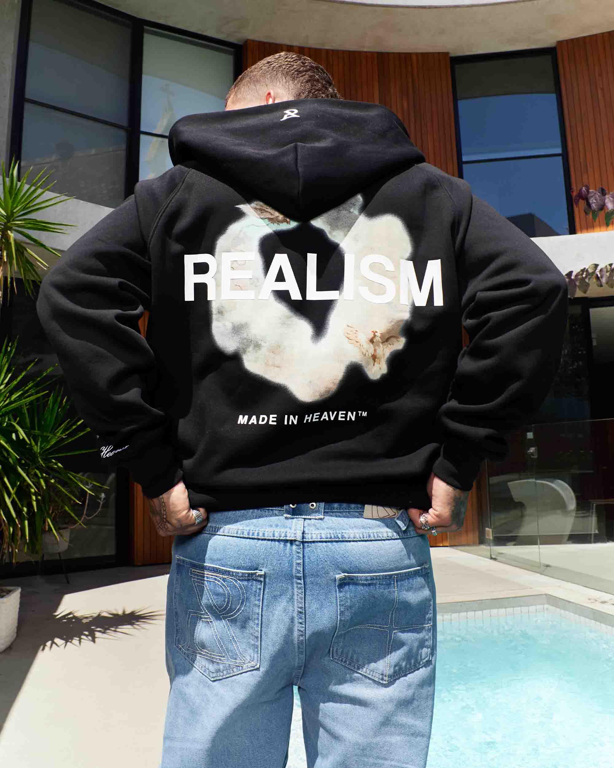This core classic zip hoodie has been reimagined with an angelic twist. Made with Realism's signature comfy fleece in an oversized black guise, this zip hoodie features metal accents including custom "R" branded zip, chest emblem and pocket tag. An embroidered "R" on the hood, sleeve cuff embroidery and the exclusive screen printed cherub on the back makes this piece a dream.
