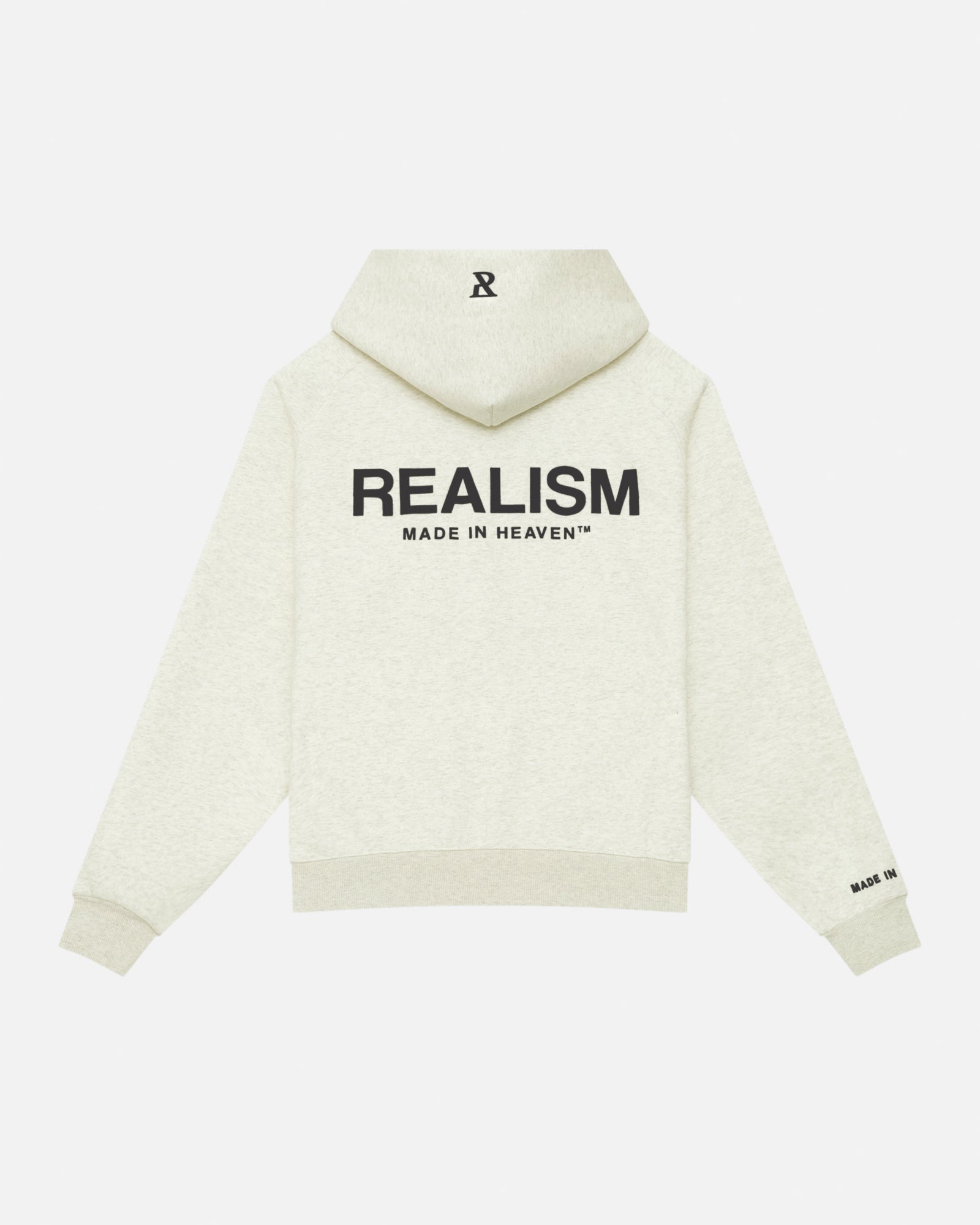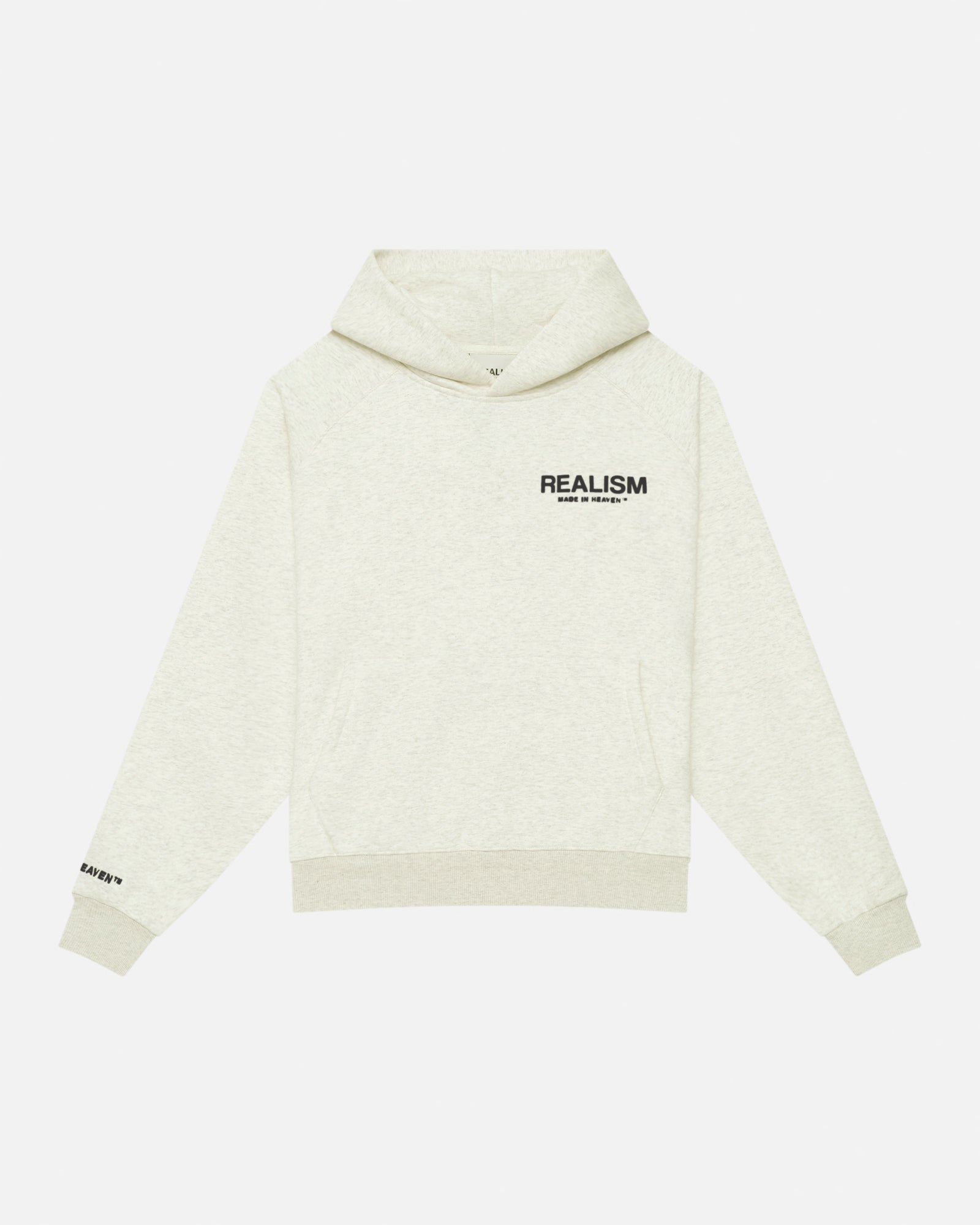 The ultimate hoodie. Premium, comfortable, and designed with purpose. Featuring Realism's signature 350gsm fleece crafted into a raglan, oversized silhouette, this hoodie is accentuated with 3-dimensional silicone applique logos on the front and back. An embroidered "R" logo on the hood and a "Made in Heaven" motif on the right sleeve complete this iconic design.