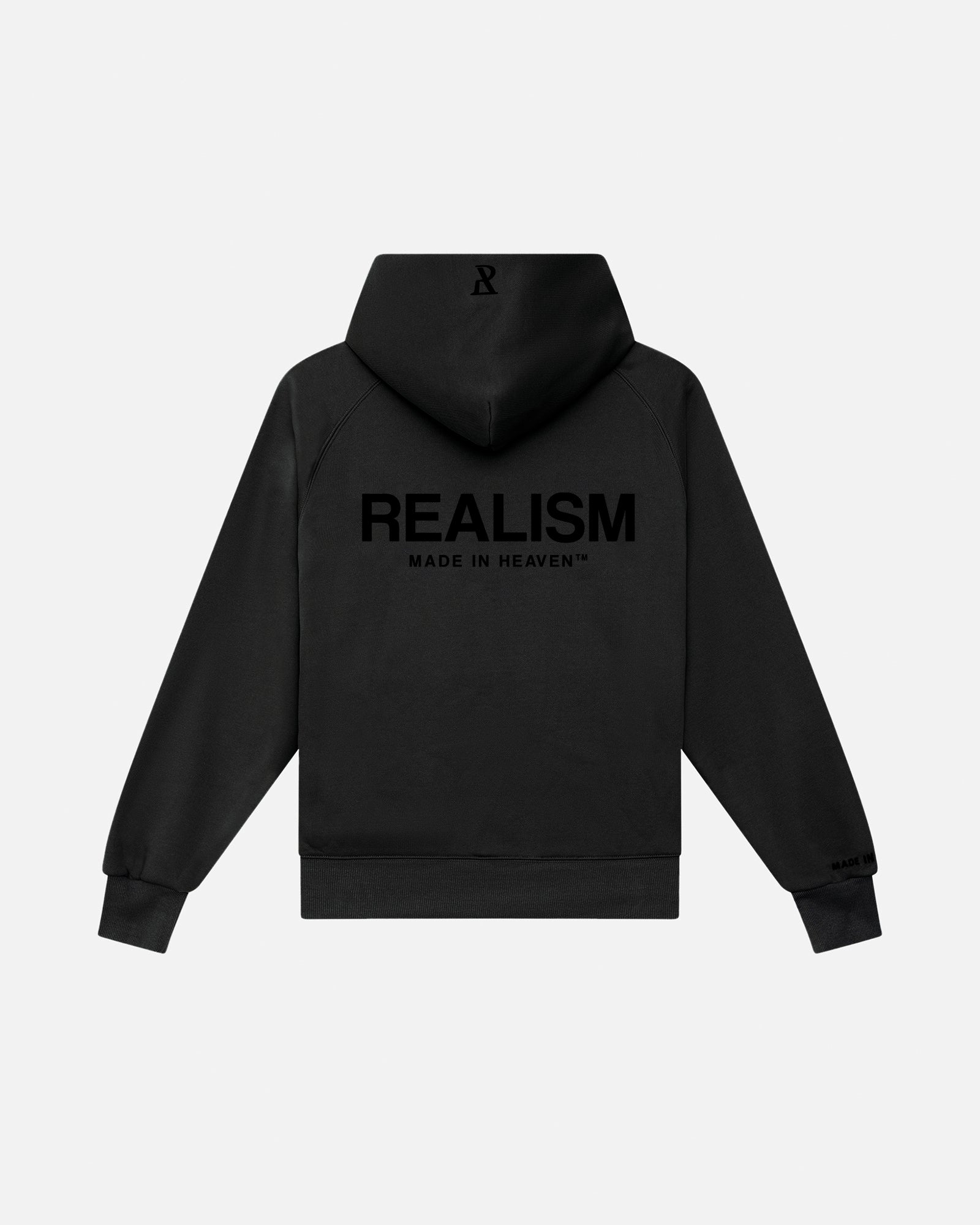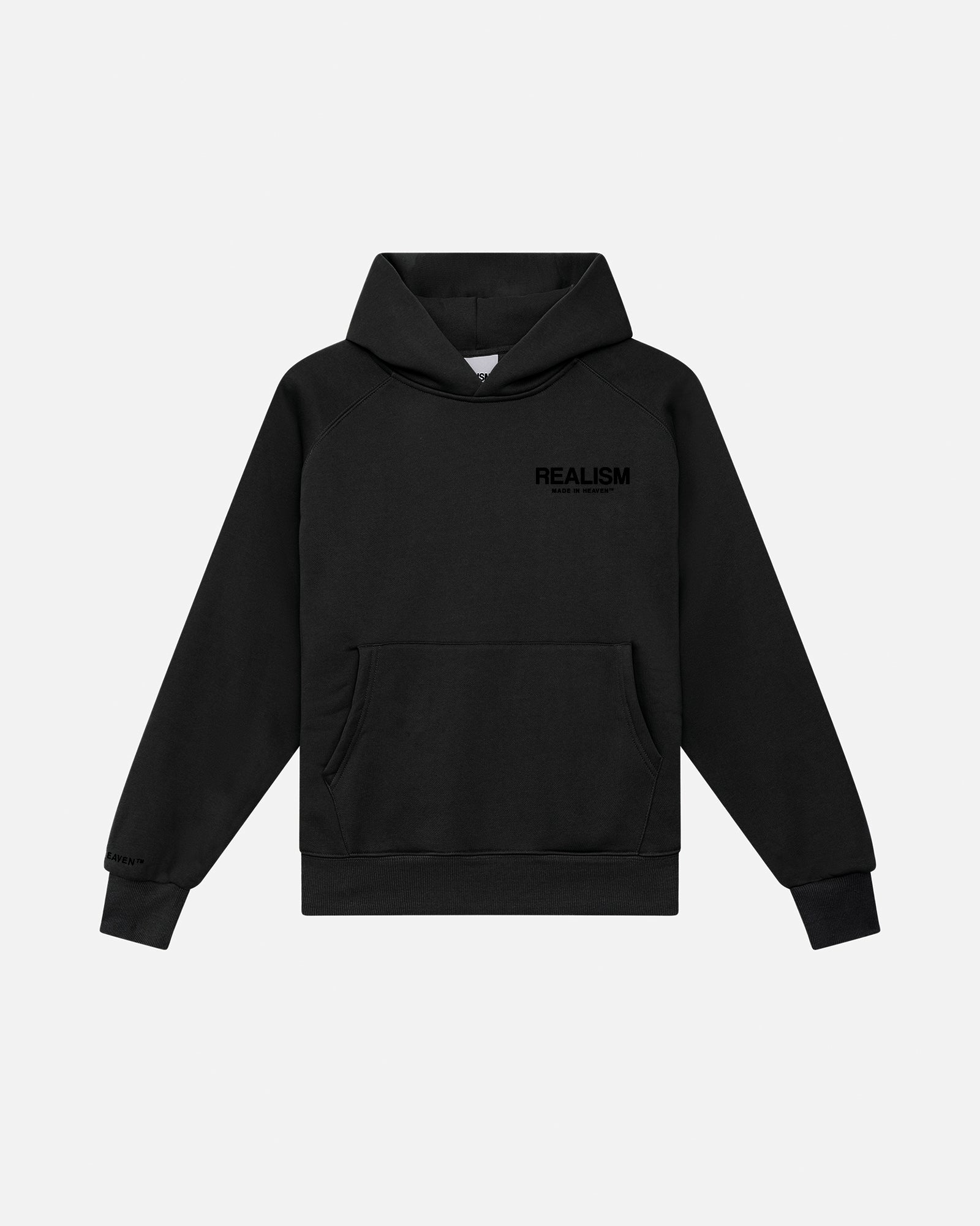 The ultimate hoodie. Premium, comfortable, and designed with purpose. Featuring Realism's signature 350gsm fleece crafted into a raglan, oversized silhouette, this hoodie is accentuated with flock applique logos on the front and back. An embroidered "R" logo on the hood and a "Made in Heaven" motif on the right sleeve complete this iconic design.