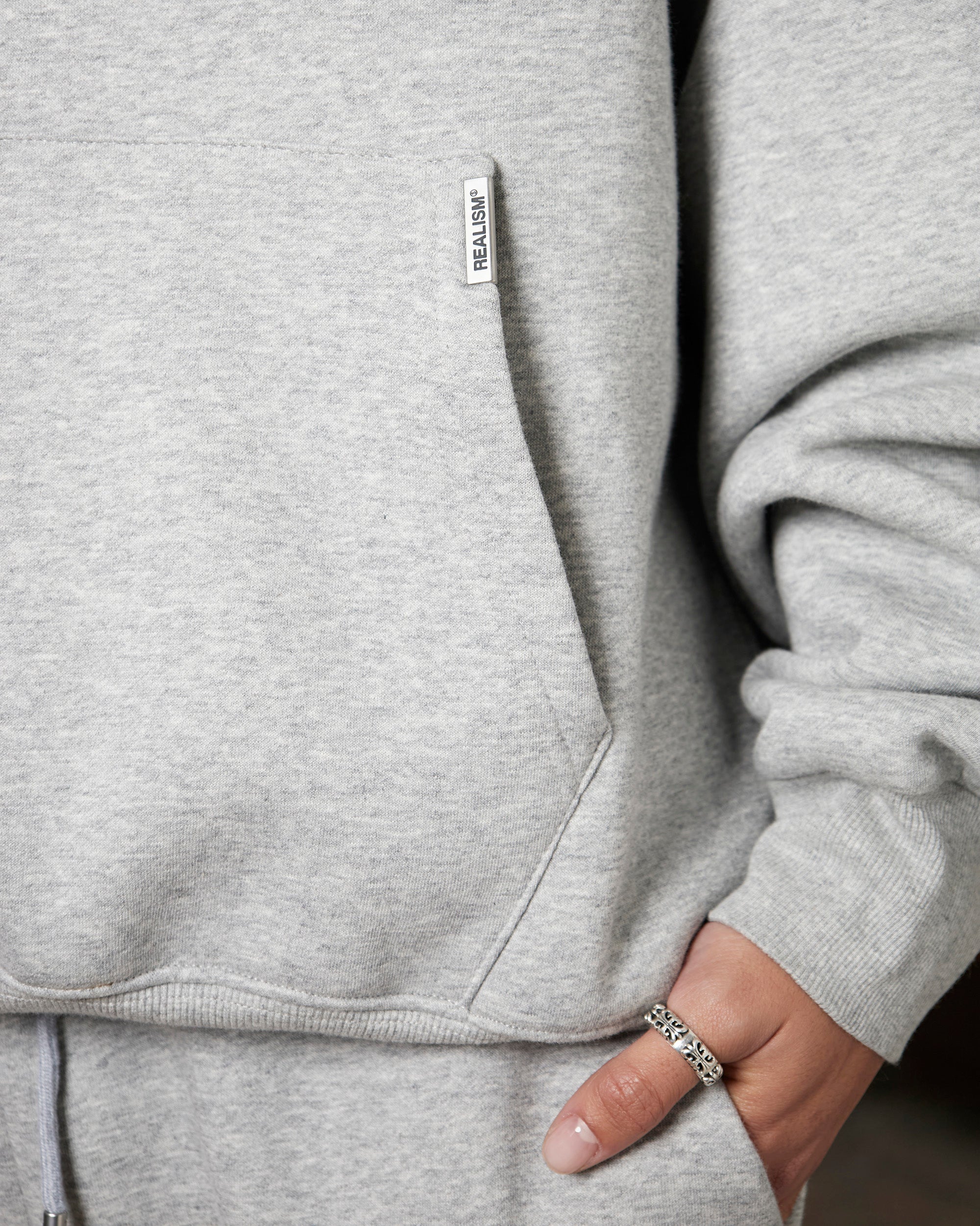 This staple hoodie is refreshed with a deluxe signature from the Realism Radiant collection. Made with Realism's signature comfy fleece in a oversized Marle Grey guise, this hoodie features metal accents including custom "R" branded zips, chest emblem and tag. An embroidered "R" on the hood, silicon applique logo on the back and sleeve print ties together a design that captures the essence of premium loungewear.