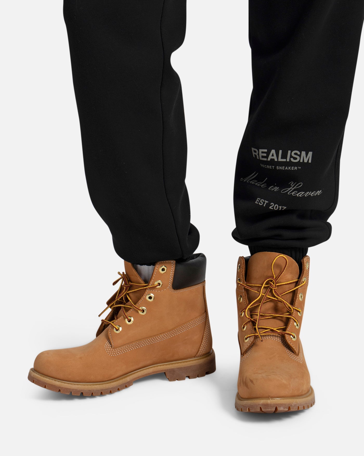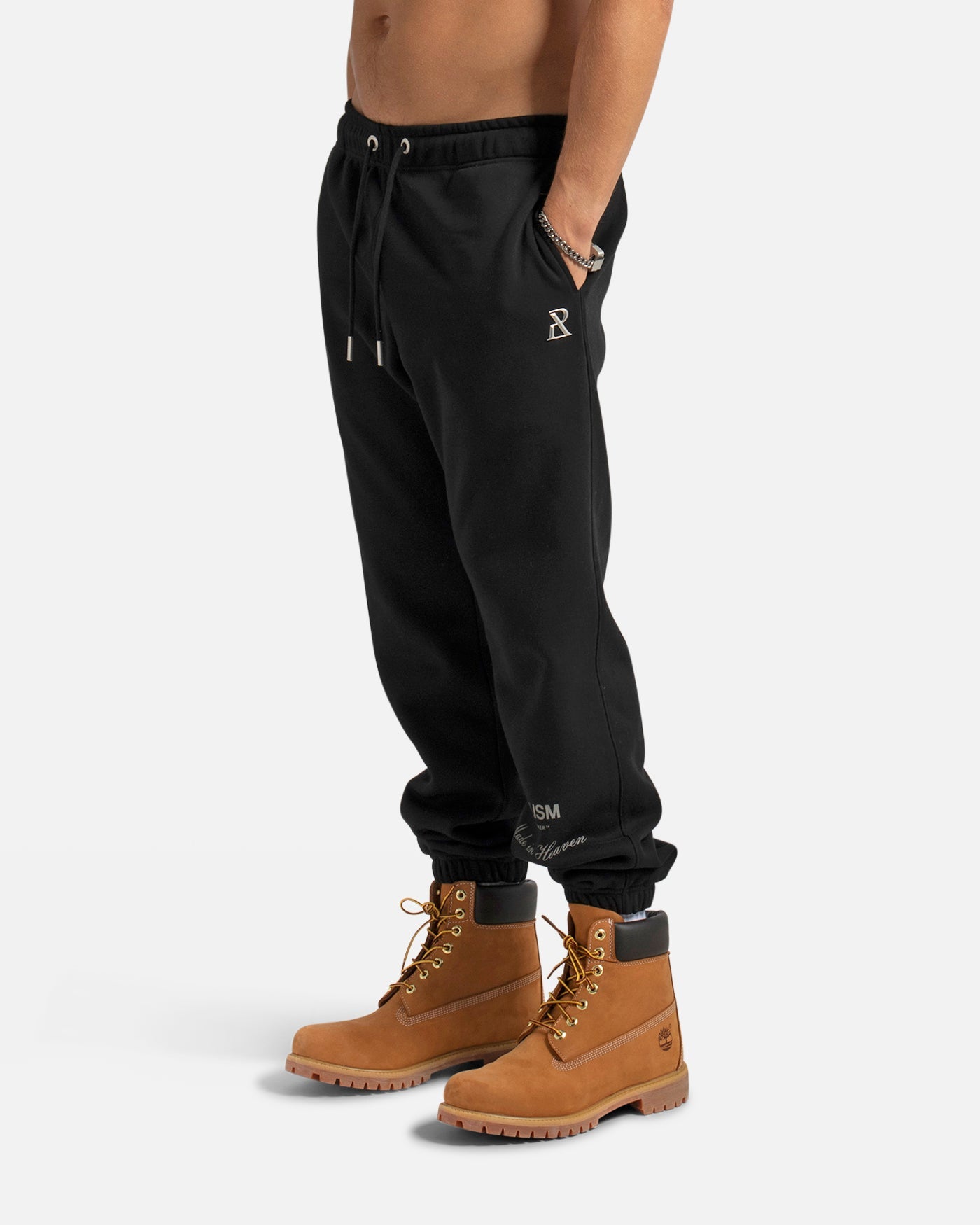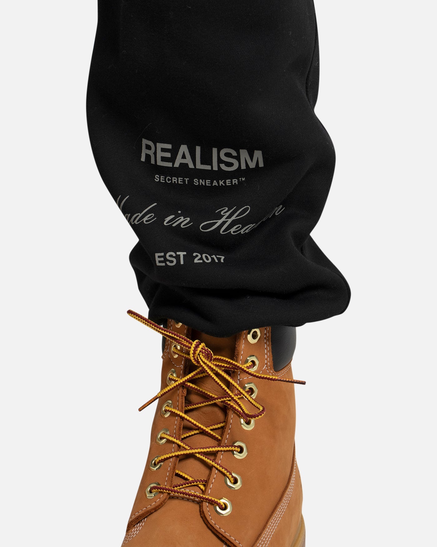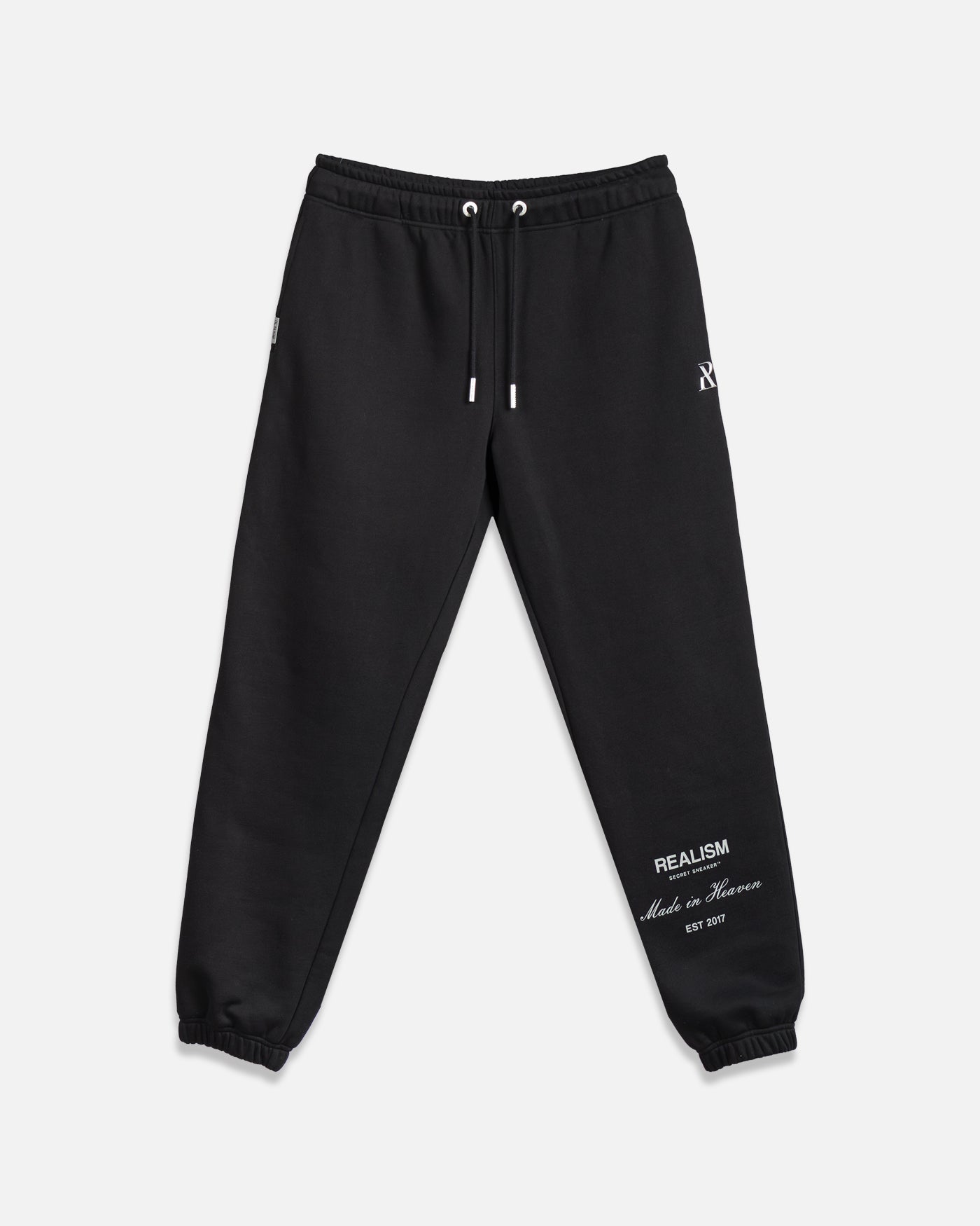 This classic silhouette is refreshed with a deluxe signature from the Realism Radiant collection. Made with Realism's signature comfy fleece in a relaxed Black guise, this sweatpant features metal accents including custom "R" branded drawstring openings & aglets, thigh emblem and tag. An embroidered "R" on the back pocket and shin print ties together a design that captures the essence of premium loungewear.