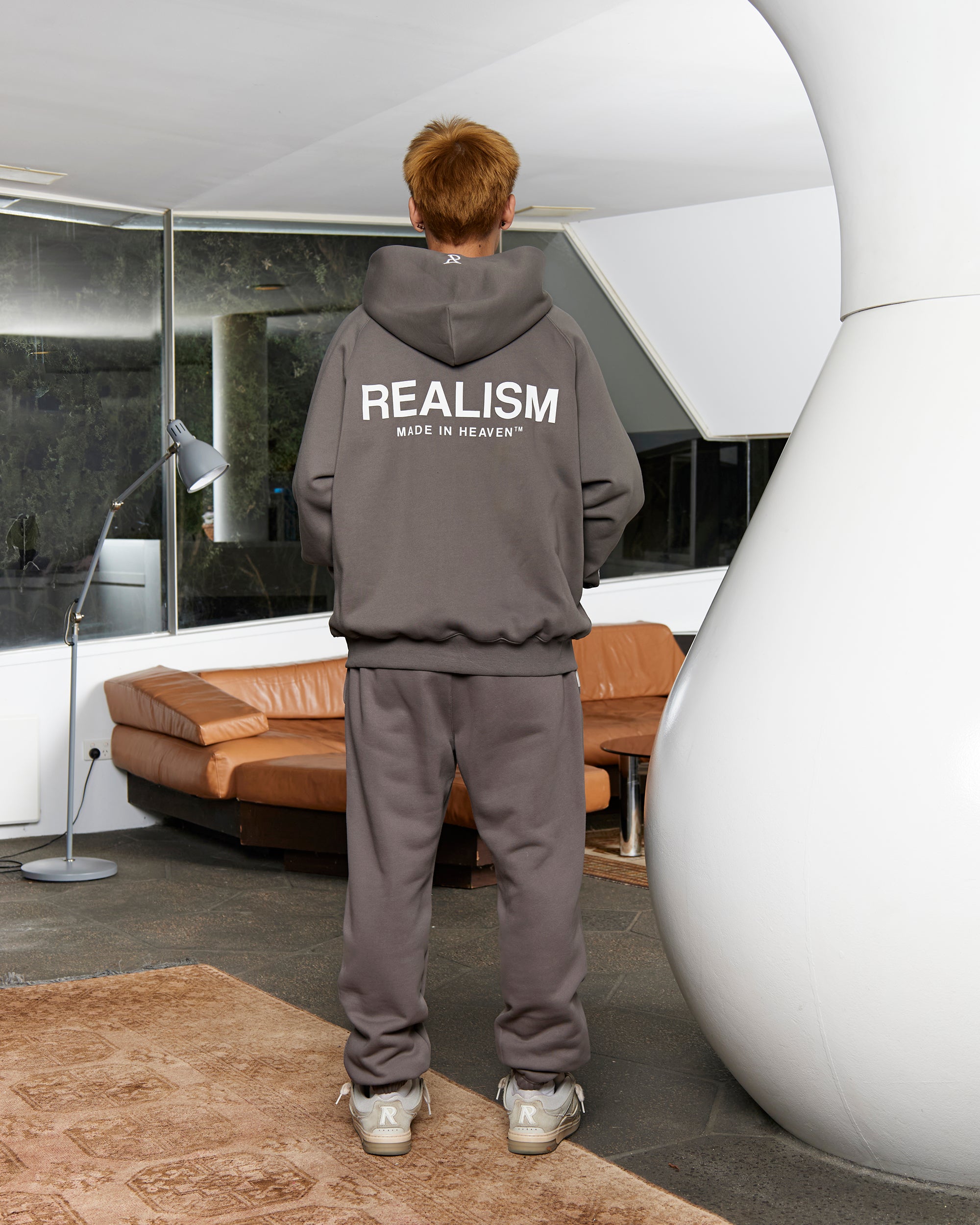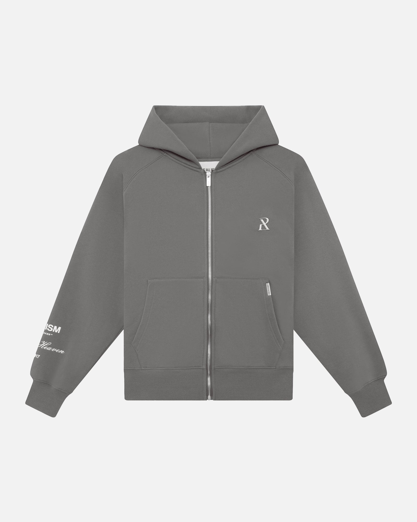 This staple zip hoodie is refreshed with a deluxe signature from the Realism Radiant collection. Made with Realism's signature comfy fleece in a oversized Cool Grey guise, this zip hoodie features metal accents including custom "R" branded zips, chest emblem and tag. An embroidered "R" on the hood, silicon applique logo on the back and sleeve print ties together a design that captures the essence of premium loungewear.