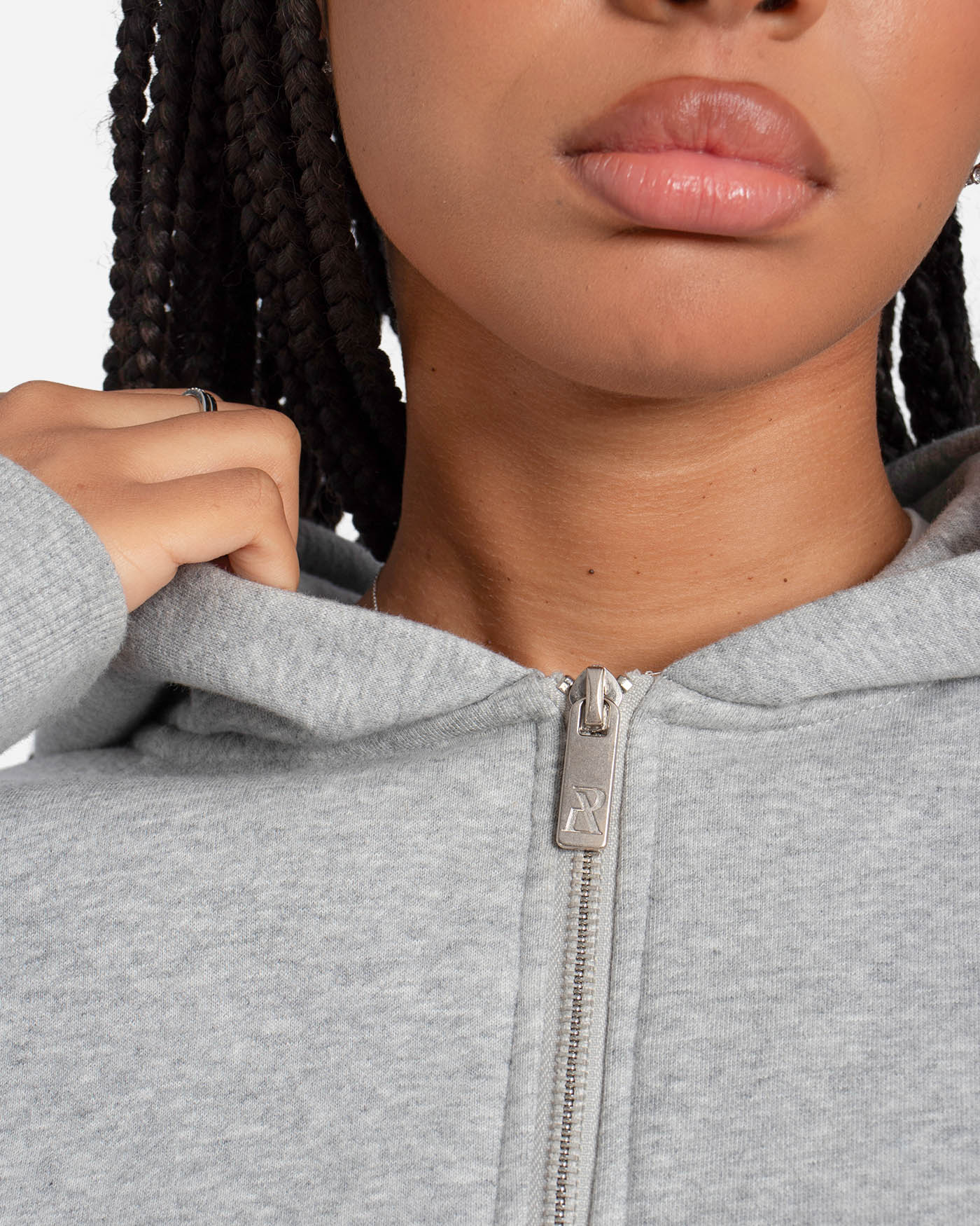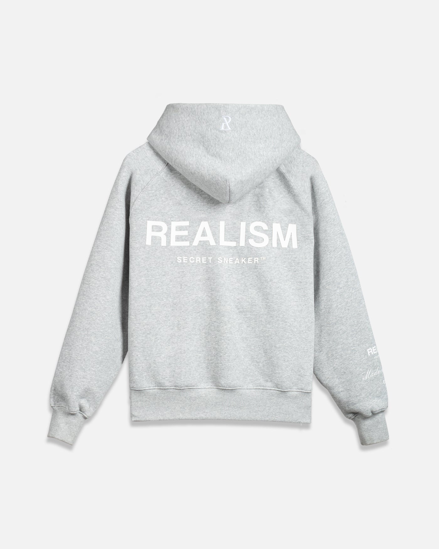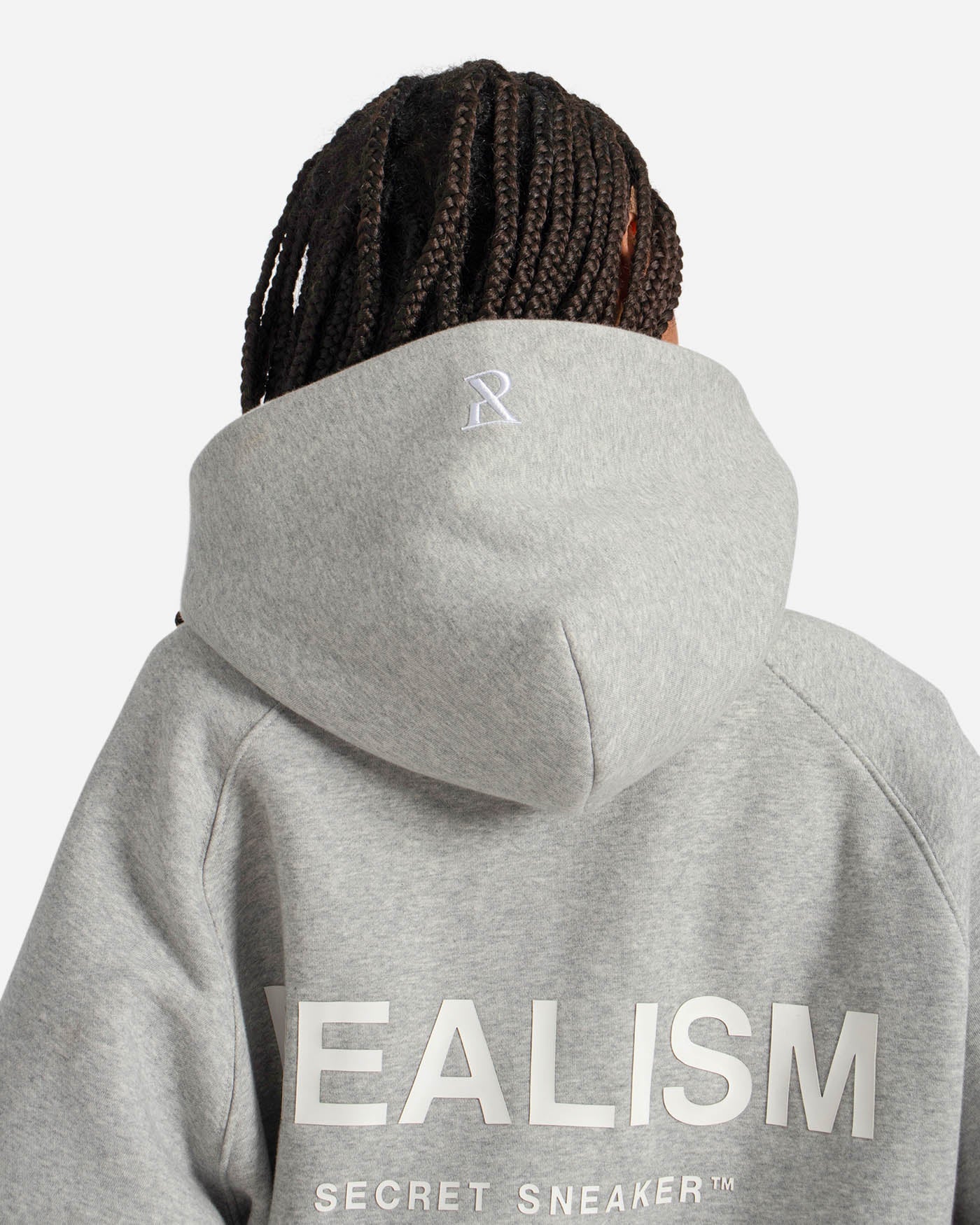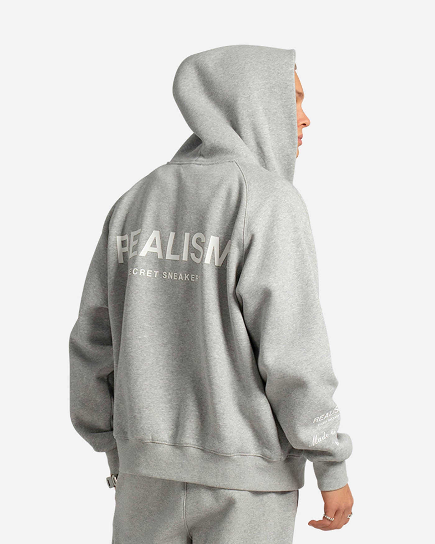 This staple zip hoodie is refreshed with a deluxe signature from the Realism Radiant collection. Made with Realism's signature comfy fleece in a oversized Grey Marle guise, this zip hoodie features metal accents including custom "R" branded zips, chest emblem and tag. An embroidered "R" on the hood, silicon applique logo on the back and sleeve print ties together a design that captures the essence of premium loungewear.
