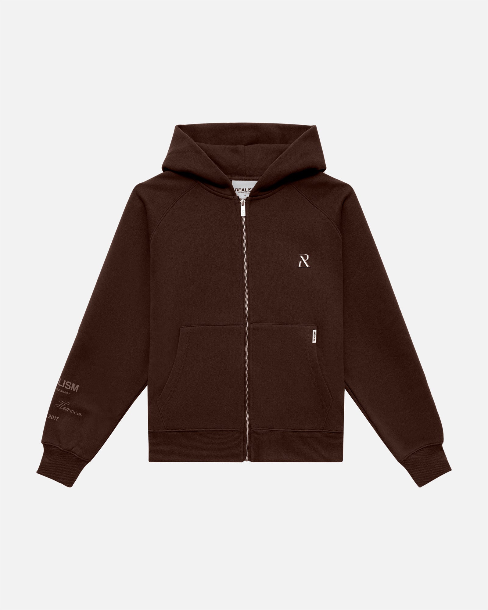 This staple zip hoodie is refreshed with a deluxe signature from the Realism Radiant collection. Made with Realism's signature comfy fleece in a oversized Mocha guise, this zip hoodie features metal accents including custom "R" branded zips, chest emblem and tag. An embroidered "R" on the hood, silicon applique logo on the back and sleeve print ties together a design that captures the essence of premium loungewear.