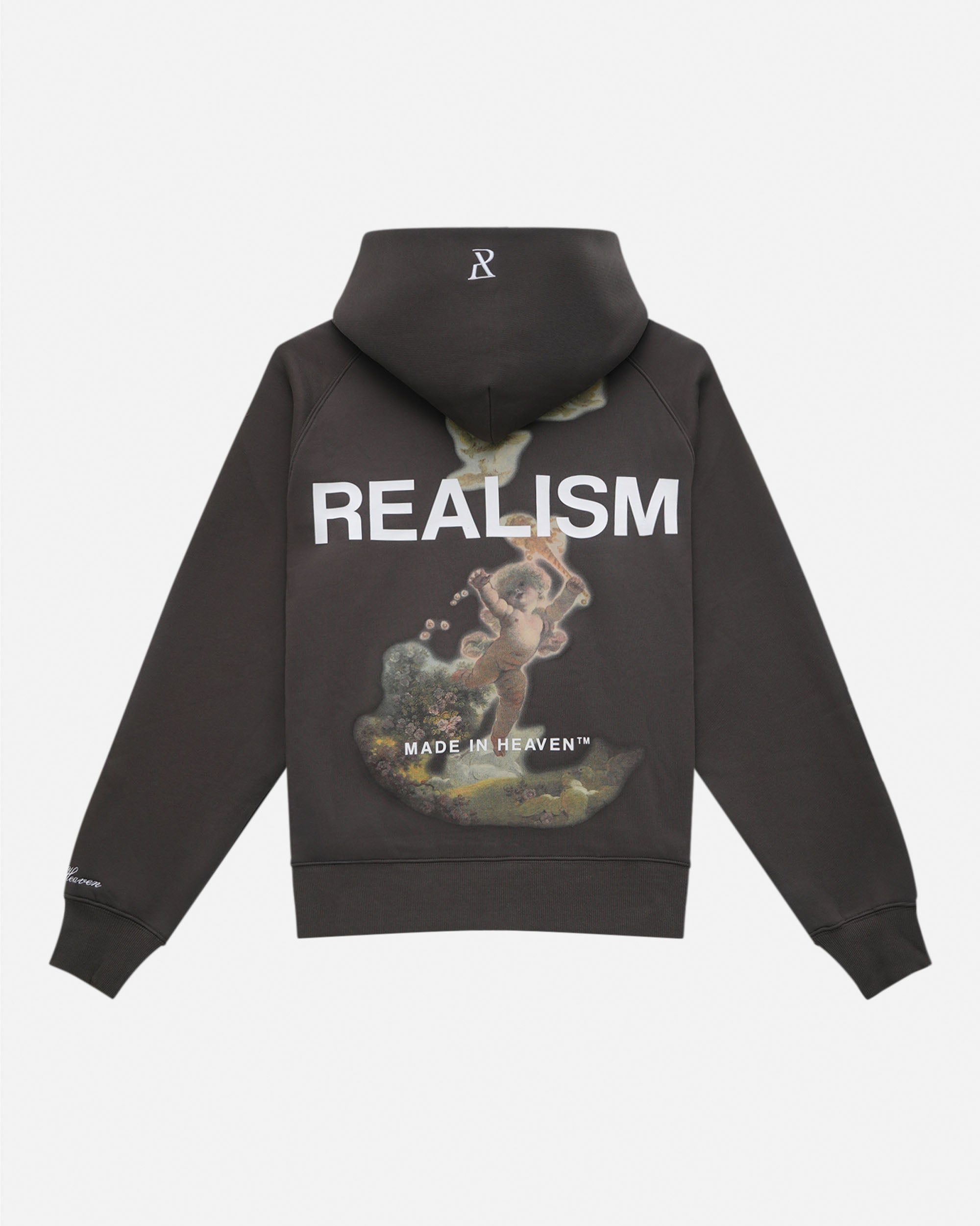 This core classic zip hoodie has been reimagined with an angelic twist. Made with Realism's signature comfy fleece in an oversized silhouette, this zip hoodie features metal accents including custom "R" branded zip, chest emblem and pocket tag. An embroidered "R" on the hood, sleeve cuff embroidery and the exclusive screen printed cherub on the back makes this piece a dream.