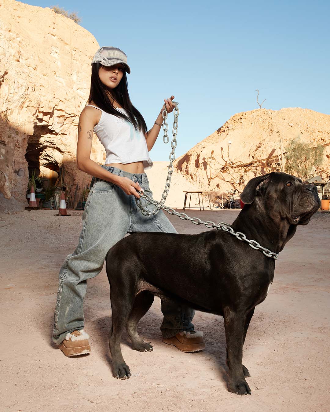 Jai is 185cm tall and wears an L, Mia is 160cm tall and wears an S.